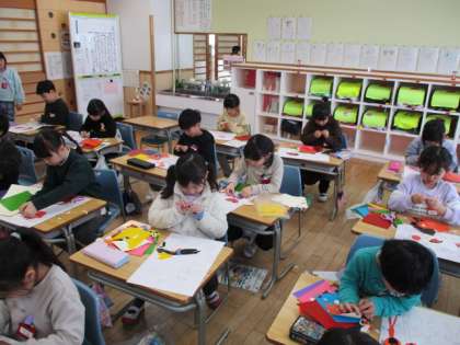 図工でシールを使った紙版画を制作しています。テーマは「1年生の思い出 楽しかったこと」です。入学してから、たくさんの学習や行事など楽しいことがたくさんありましたね。