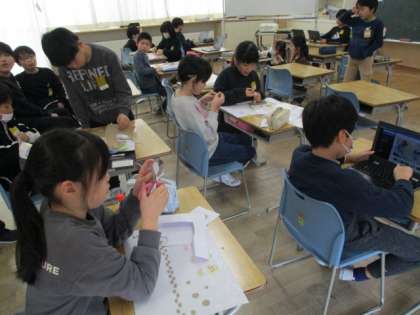 図工で紙版画を制作しています。昔話がテーマのようです。