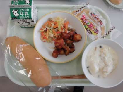 今日の給食は、コッペパン・牛乳・魚のアングレス・にんじんと豆のラペ・鶏肉のフリカッセ・ショコラクレープです。今日は給食週間4日目です。今日はオリンピック開催国のフランスをテーマとした献立です。フランスの家庭料理のフリカッセ(白い煮込み)やラペ、魚のアングレスが登場しています。ショコラクレープもおいしそうですね!