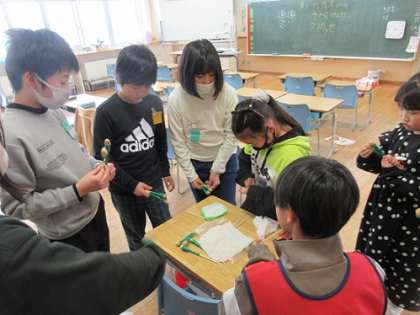 異学年で行うハンカチ落としでは下級生への思いやりが感じられました。折り紙工作では、2年生が折り紙を5枚使った大きな花のつくり方を教え、時間中に完成させようとみんな集中して折っていました。ゲームを行ったファミリーでは、上から落としたティッシュを割り箸でつかむなど、2年生が考えてきたゲームのルールを伝える上に、使う道具も準備してきており、時間いっぱい楽しみました。