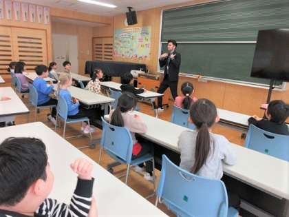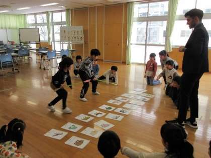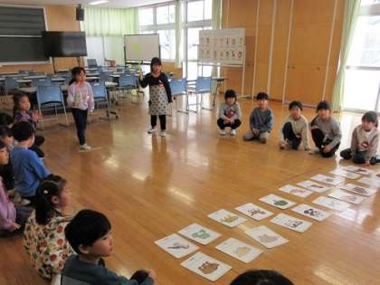 最初に、英語で交わす挨拶を教えてもらい、反復練習をした後、「My name is 〜.」の言い方で全員自己紹介をしました。体の調子を表す言い方をしたり、「アニマルカルタ取り」で競ったりして、45分間の英語活動を楽しみました。
