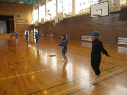 外は晴れていますが、体育館は冷えています。けれども、元気な1年生は寒さに負けず縄跳びをしています。回数も少しずつ増えてきましたね。水橋学園の体操服がちらほら見られます。