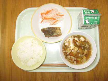 今日の給食は、ごはん、牛乳、魚のかば焼き、なます、すまし汁です。