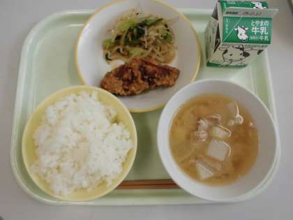 今日の給食は、ごはん・牛乳・豚汁・もやしのおひたし・魚の利休揚げです。