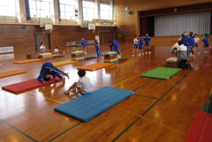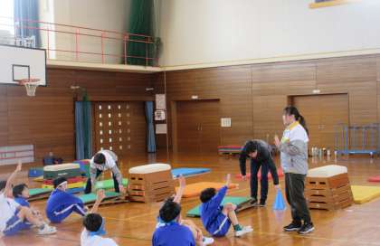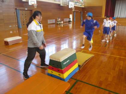 今日は、市のスポーツ指導員の方に来ていただき、跳び箱の跳び方を教えていただきました。できることを増やしたり、自分の技をさらに磨いたリするなど、全員が楽しく活動に取り組んでいました。