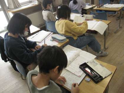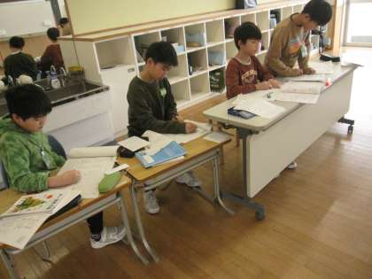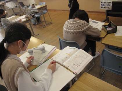 4年生では、小数の計算の学習を一人一人のペースで学べるよう自由進度学習という新しい学習方法で進めています。自分で学習計画を立て、その日の進み具合で調整しながら取り組みます。もちろん分からないときは先生や友達に聞きます。集中して問題に取り組む姿が見られました。