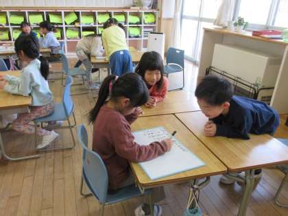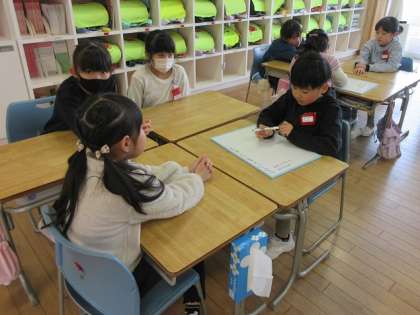 来年度、本校に入学する年長さんたちを招待する会が、2月下旬に行われます。子供たちは、3人グループでアイディアを出し合い、とても活発に話し合いました。