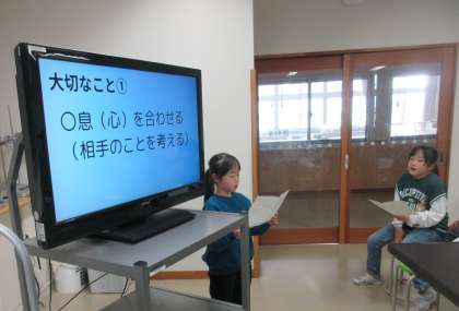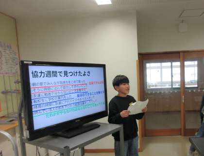 水橋東部、水橋西部、水橋中部の3校がリモートで道徳の授業を行いました。「四人五きゃく」という話を題材に、協力について考えたことをそれぞれ発表しました。協力するためには、相手との関係づくりが大切であるということが分かりました。