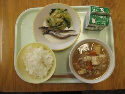 今日の給食は、ごはん、牛乳、ししゃもの米粉揚げ、昆布和え、厚揚げの中華煮込みです。