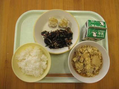 今日の給食は、ごはん、牛乳、にんじんシューマイ、ひじきの炒め煮、卵とじです。