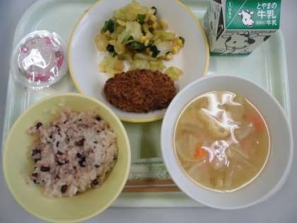 今日の給食は、赤飯・牛乳・みそ汁・コーン和え・とんかつ・さくらゼリーです。今日は早いですが、卒業お祝い献立でした!6年生のみなさんは、小学校で給食を食べるのも残り13日となりました。一日一日味わっていただきましょう^^
