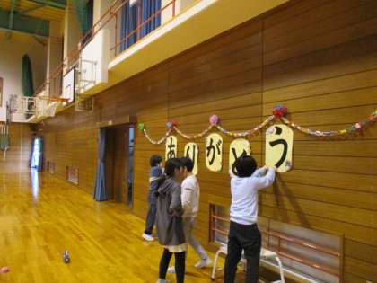 明日の卒業を祝う会の準備を進めていました。明日は6年生や他の学年みんなが楽しめる会になることでしょう。