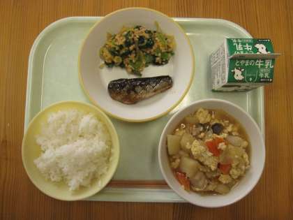 今日の給食は、ごはん、牛乳、いわしの土佐煮、納豆和え、親子煮です。