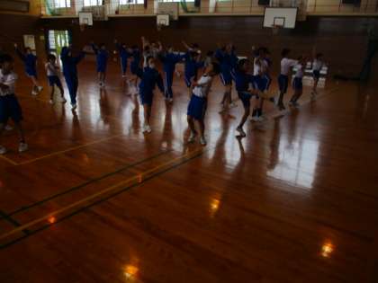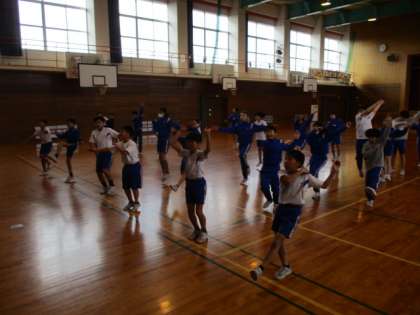 卒業を祝う会で披露したダンスを体育のウォーミングアップでも行っています。ノリノリで楽しみながら体が温まります!