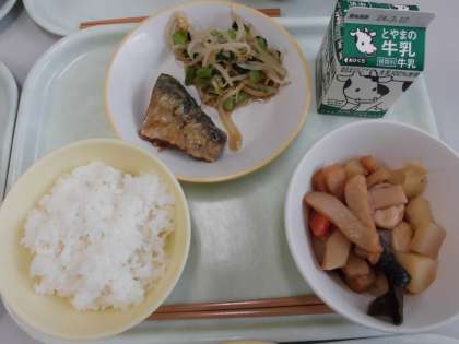 今日の給食は、ごはん・牛乳・かんとうだき・おひたし・魚のあまみそかけです。