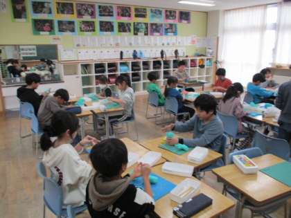 図工で粘土細工に取り組んでいました。各班でテーマを決めて作りました。。