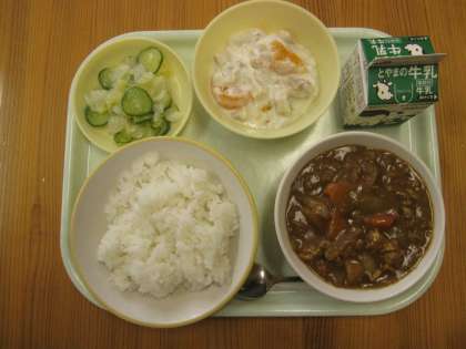 今日の給食は、ごはん、牛乳、カレーライス、フレンチサラダ、フルーツヨーグルトです。