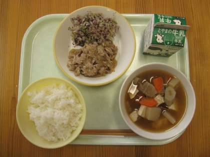 今日の給食は、ごはん、牛乳、豚肉の生姜焼き、ゆかり和え、けんちん汁です。