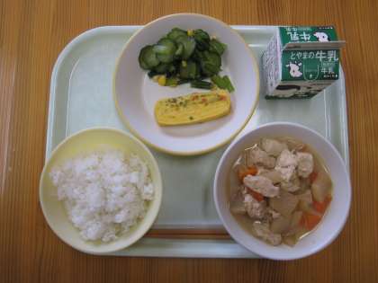 ごはん、牛乳、千草焼き、コーン和え、鶏肉と大根のごますき煮です。