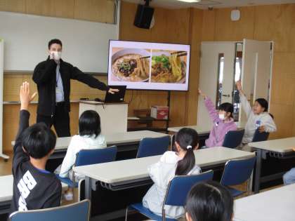 初めての外国語活動では、ALTの先生の自己紹介を聞きました。アリゾナ出身で、ラーメンが大好きな先生です。