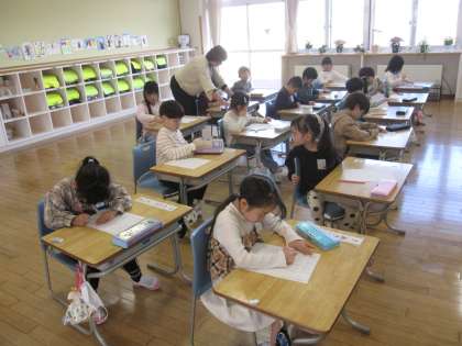 自分の名前を書いていました。鉛筆を持つ手と反対の手でしっかり紙を押さえて書いていました。