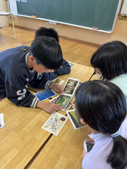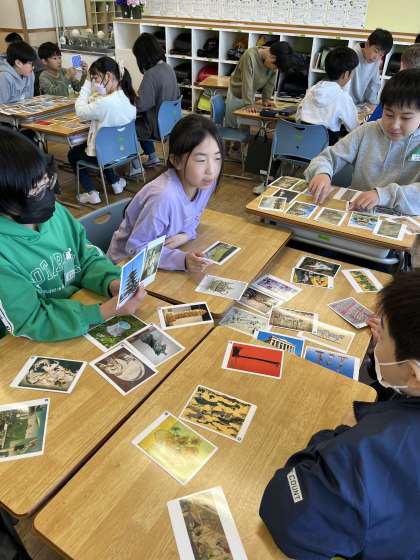 5年生になって、はじめての図画工作科の学習をしました。この日は、アートカードの中から共通点があるものを見付け、グループの友達を納得させられたらカードを手に入れることができるというゲームをしました。