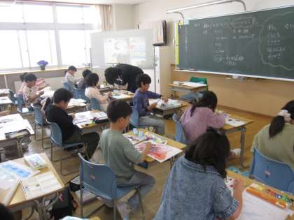 図工の時間です。絵の具と水を混ぜて、「いいかんじ」の色をつくって表しています。
