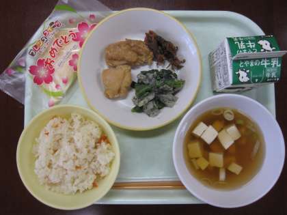 今日は入学お祝い献立です。ちらしずし、鶏肉のから揚げ、すまし汁、ほたるいかの竜田揚げ、お祝いデザート、よごしです。水橋漁民合同組合より提供されたほたるいかの竜田揚げが出されました。