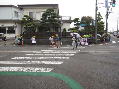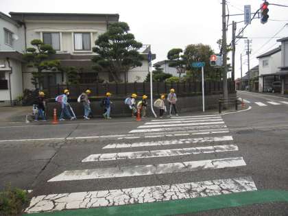 振替休業日明けの火曜日です。少し肌寒さを感じます。二日間ゆっくり休んで、元気に登校しています。班長さんは後ろの下級生がついてきているか確認しながら歩いています。