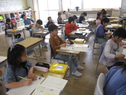 先生の話を聞きながら、姿勢よくノートに書いています。国語辞典に「つめ」「はしら」といった言葉があります。分からない言葉があったら、自分でさっと調べることができたらいいですね。