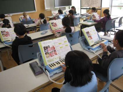 2年生 授業風景 公開日 2024/04/23 更新日 2024/04/23 活動の様子 音楽の時間です。「メッセージ」という曲に合わせて歌ったり演奏したりしていました。教科書には日本や韓国など世界の子供たちの写真が出ていました。