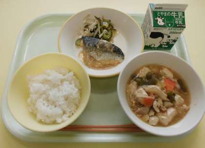 今日の給食は、ごはん、牛乳、さばのみそ煮、ごま酢和え、豆腐と野菜のうま煮です。