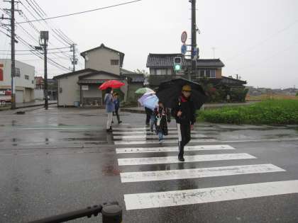 今朝は、雨が激しく降る朝となりました。足下に気を付けながら登校してきた子供たちです。