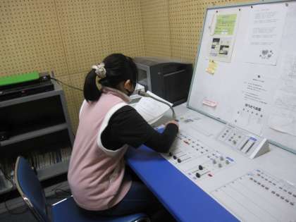 朝の放送では英語に挑戦。日本語に続けて英語で日付や天気などを言っています。「Let's sing the morning song.」 朝の歌が聞こえてきました。