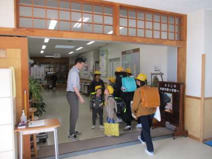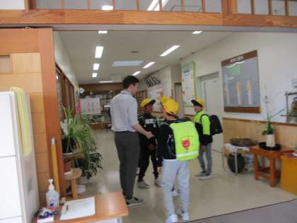 朝からALTの先生が子供たちを出迎え、英語で挨拶をしています。How are you?にうまく答えられたかな?