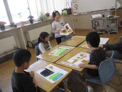 生活科の時間です。図書室で見つけたことをグループの友達にお話していました。