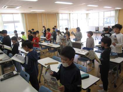 5年生は歌が大好き。「すてきな一歩」という曲を高音部と低音部に分かれて練習していました。