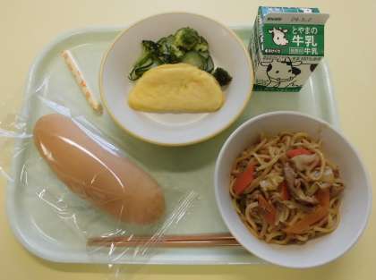 今日の給食は、減量コッペパン、牛乳、ドレッシングサラダ、焼きそば、棒チーズです。