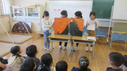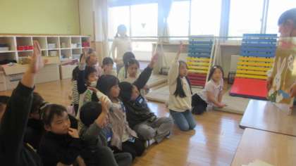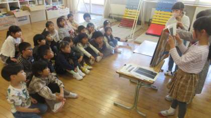 読み終わった後に、「おばけのてんぷら」に関するクイズを出したところ、1年生が積極的に手を挙げていました。1年生が喜んで聞いてくれたことで2年生もとても嬉しそうでした。