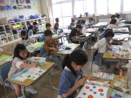 図画工作科で「立ち上がった絵のせかい」という学習をしていました。平面の絵と立ち上がらせた絵の二つを描いていました。組み合わせるのが楽しみです。
