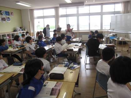 春について季節の言葉を使って文章を書いていました。友達がつくったものを読み上げています。静かに、話す人の方を見て聴いていました。