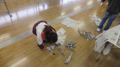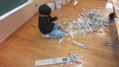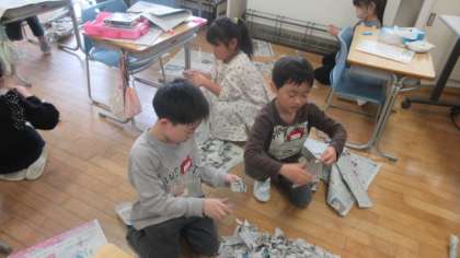 図画工作では、「新聞紙となかよし」の学習をしました。新聞紙を丸めたり、ちぎったりしながら、創造しました。次回は、グループで協力してつくりたいと思います。