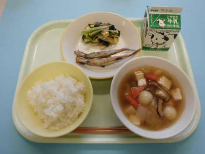 今日の給食は、ごはん、牛乳、ししゃものから揚げ、コーン和え、白玉汁です。