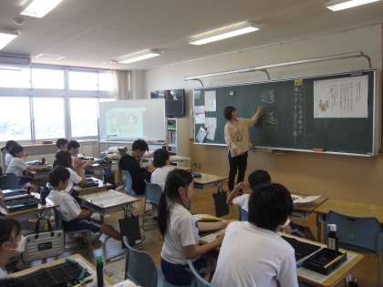 書写の時間です。「道」の文字から「しんにょう」の部分とその他の部分の組み立てについて話を聴いていました。学んだことを実際毛筆で書く際に生かしましょう。