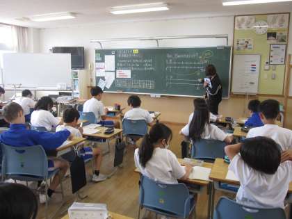 5年生 授業風景 公開日 2024/05/15 更新日 2024/05/15 活動の様子 算数で比例の関係について、数直線を使って考えていました。身の回りにも比例の関係を生かして求められるものがあるでしょうか。
