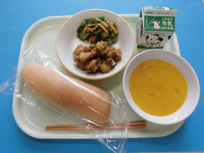今日の給食は、コッペパン、牛乳、鶏肉とひよこ豆のカレー風味、イタリアンサラダ、かぼちゃポタージュです。