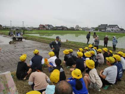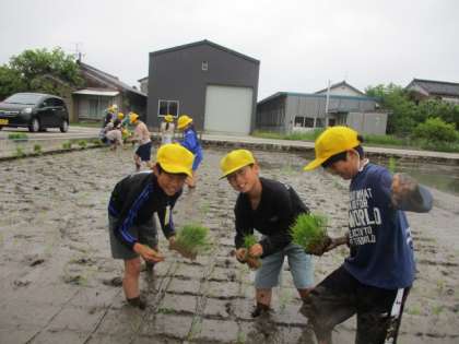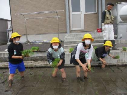 今日は地域の方に教えていただき、田植え体験を行いました。子供たちは、最初は土の感触にびくびくしながらも、慣れるとしだいに手つきがよくなってきました。
