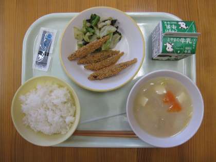 今日の給食は、ごはん、きびなごのさくさく揚げ、ごまびたし、呉汁、のり佃煮です。