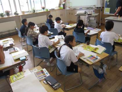 国語「はなのみち」の最後の場面の絵に色を塗っていました。挿絵を見て、動物たちはどんなことを話しているのか想像していました。