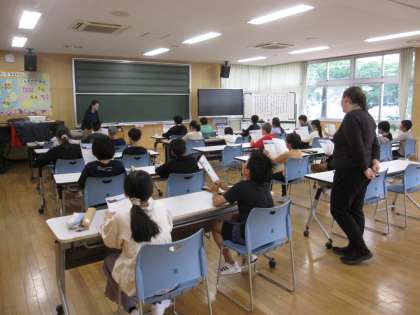 音楽の時間です。二部合唱で「いつでもあの海は」の曲を歌っていました。